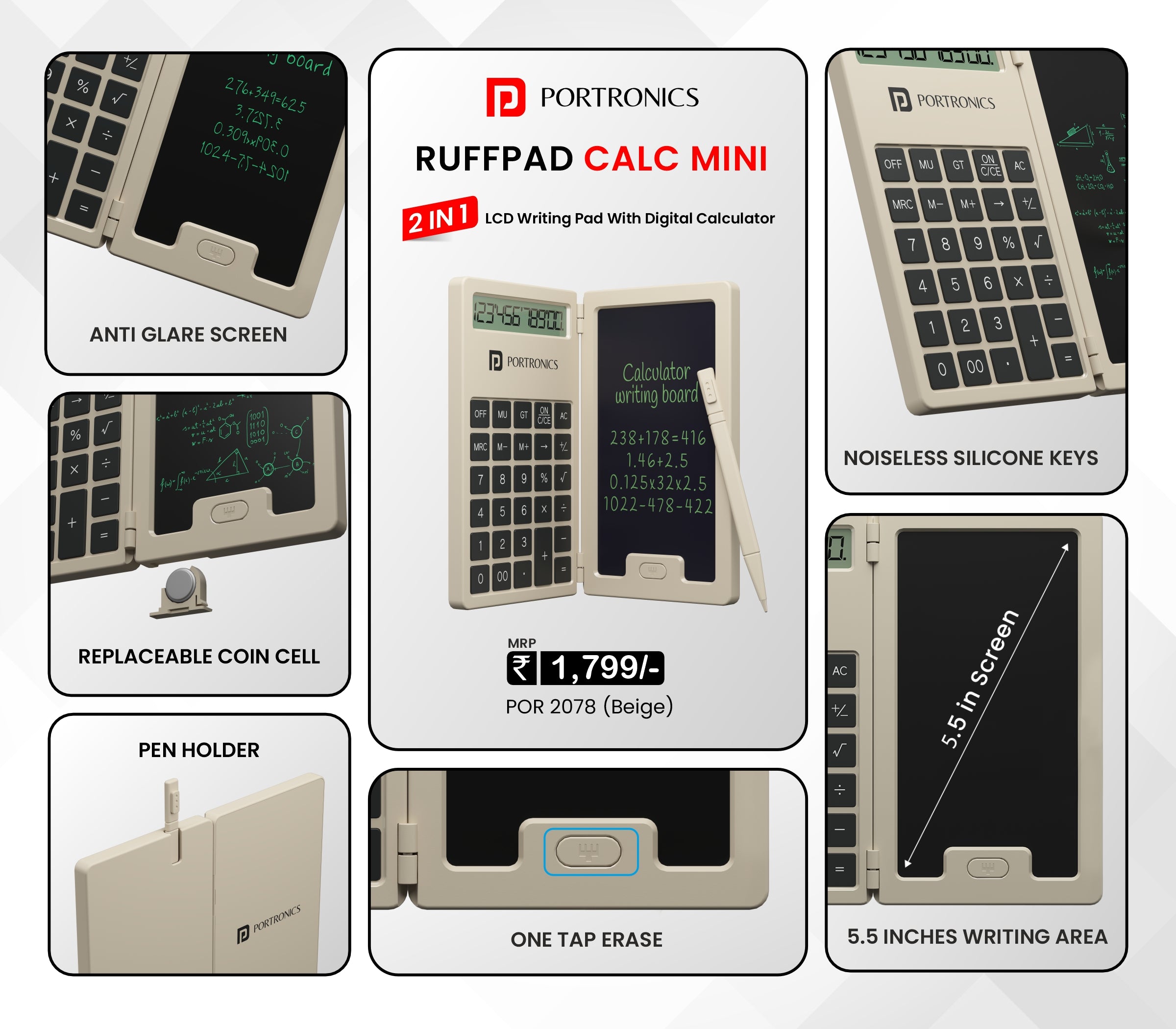 - LCD Writing Pad with Calculator: With Portronics Ruffpad Calc Mini, switch between a digital calculator & an LCD writing pad, enhancing efficiency in both calculations & note-taking. Experience the power of 2 tools in 1 device.